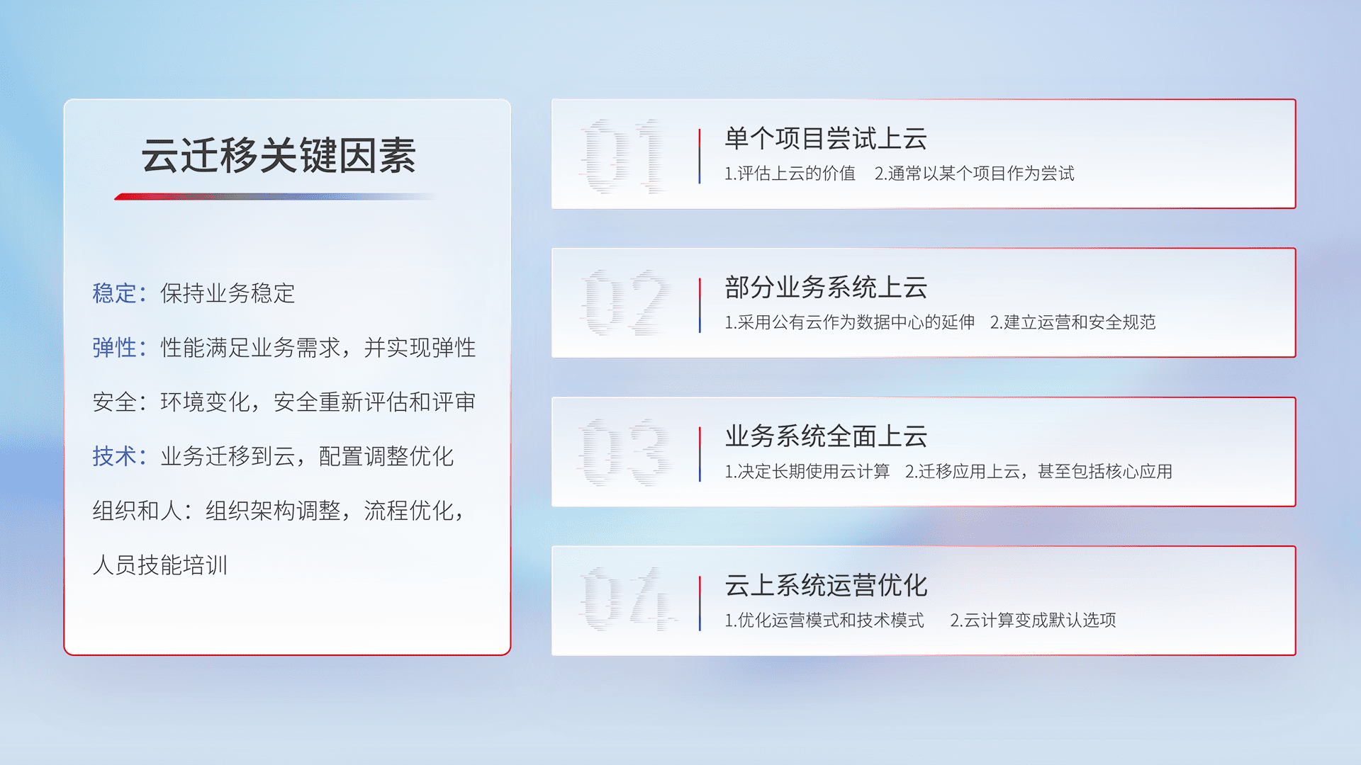 结合实际业务,,,,从规划设计、、、云平台选型、、、云原生改造、、、数据迁移、、、、集成交付,,,迁移全过程为客户识别最佳上云路径,,,,做好风险识别管理,,,设计网络架构、、身份权限、、、安全审计合规、、、、操作审计、、日志审计、、、监控告警策略、、、、多站点容灾设计等,,,,对云上基础设施进行整体规划,,,提升IT治理水平,,以满足弹性、、高可用、、高性能的需求。。。。